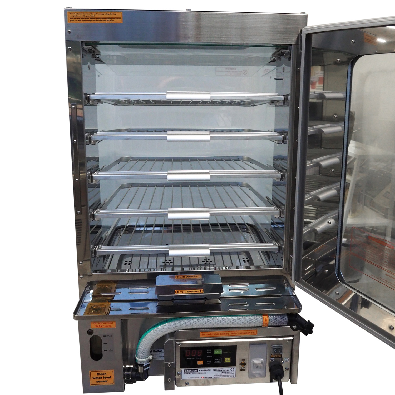 Seadmel on topeltklaasiga esiklaas, digitaalne ekraan ja luminofoorlamp ning 5 riiulit 5-kraadise kaldenurga all.