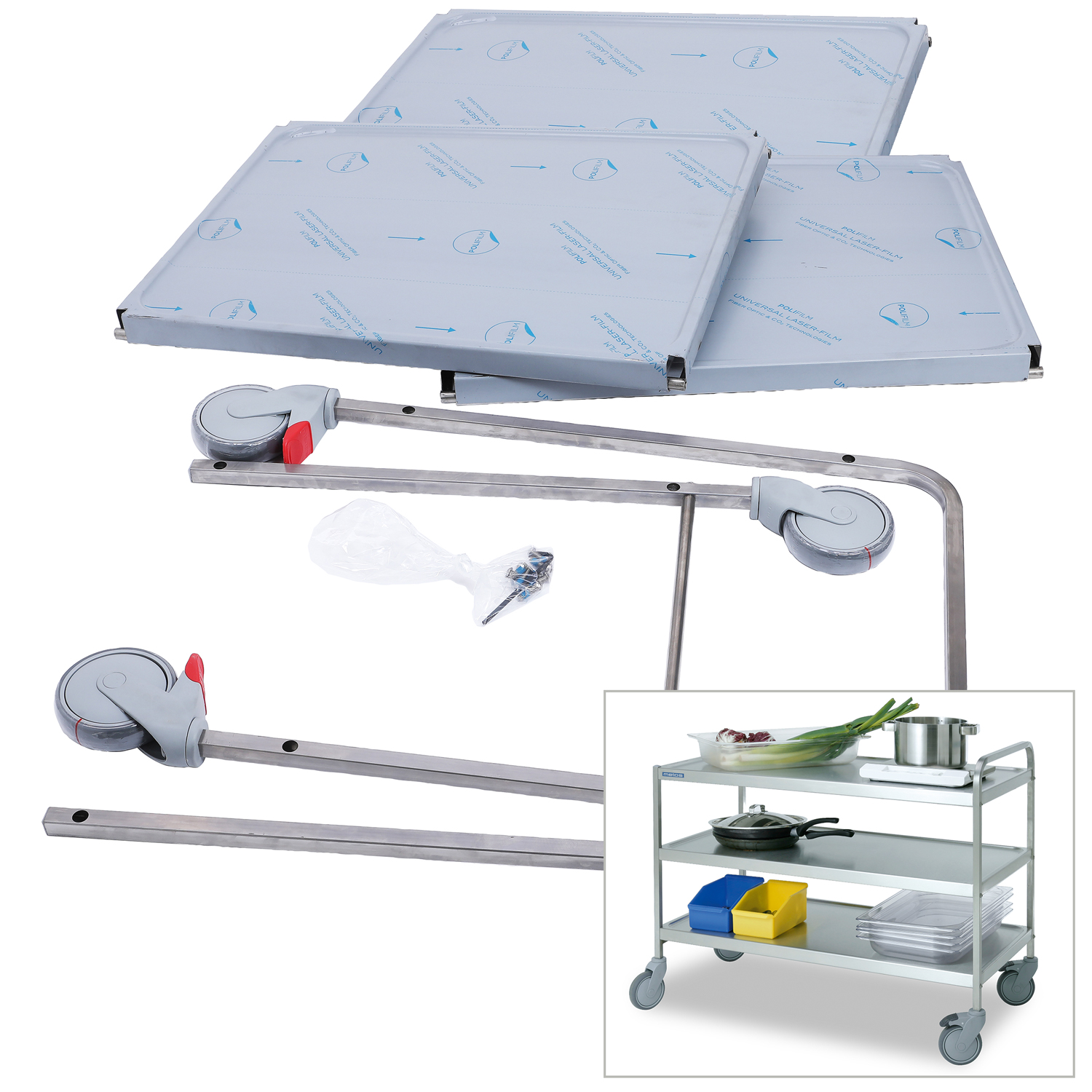 – roostevabast terasest konstruktsioon – kuullaagritega rattad Ø 125 mm, kaks piduriga – kolm tasapinda,mille vahe 230 mm – tasapinna mõõdud 585 x1120 mm – max. koormus 120 kg – riiulite all summutusmatt